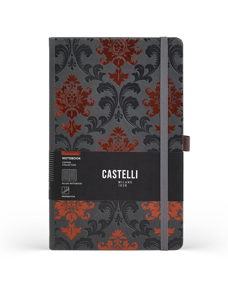 Zápisník Castelli z kolekce Copper Baroque je poctou rafinovanému designu a preciznímu zpracování. Luxusní motiv barokních ornamentů je zvýrazněn měděnou ražbou, která dodává obálce osobitý šarm. Precizní zpracování obálky doplňuje měděná fóliová ořízka, která přináší nejen nečekaný jas, ale i vizuální kontinuitu celému designu. Materiál obálky je PVC-free, na dotek měkký, s efektem termoreliéfu, který reaguje na světlo i teplo.