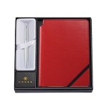 Elegantní sada kuličkového pera Calais se saténovým povrchem a červeného koženkového zápisníku. Sada je dodávaná v luxusní dárkové krabičce.