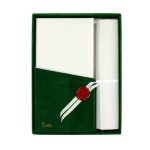 Originální dárková dopisní sada v sametové krabičce formátu A5. Dopisní sada obsahuje 12 ks ručně čerpaného papíru formátu A4, přeložených na formát DL, 12 ks obálek formátu DL a 1 ks svinutého ručně čerpaného papíru, převázaného bílou stužkou s voskovou pečetí. Okraje papíru jsou přirozeně nepravidelné a díky tomu působí dopisní papíry i obálky historizujícím a exkluzivně dekorativním dojmem.