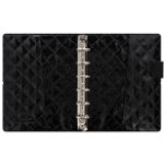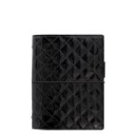 Diář Domino Luxe s leským povrchem v černé barvě s imitací prošívání a fixační gumičkou uprostřed. celý popis