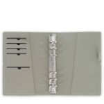 Levá vnitřní strana desek: 4 horizontální přihrádky na kreditní karty, 1 víceúčelová kapsa, pod nimi otevřená šikmo střižená vertikální kapsa po celé délce diáře.
