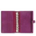 Levá vnitřní strana desek: 6 vertikálních přihrádek na kreditní karty, pod nimi otevřená vertikální kapsa po celé délce diáře.