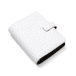 Diář Filofax z kolekce Moonlight v bílém provedení vyniká kontrastní barvou vnější a vnitřní strany desek a jemným vzorem přípomínající hvězdnou oblohu. Desky jsou vyrobeny ze syntetického materiálu s jemnou strukturou koženého vzhledu s detaily ze zlaté fólie. Velikost náplně Pocket - formát papíru 80 x 120 mm.