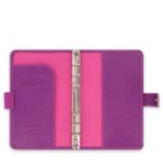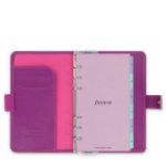 Diář klasického vzhledu se strukturovaným povrchem desek v malinové barvě. Desky jsou vyrobeny ze syntetického materiálu. Velikost diáře je Compact - užší desky než velikost Personal. Do diáře patří náplně velikosti Personal - formát papíru 95 x 171 mm. Diář je standardně naplněn českým a slovenským kalendářem.