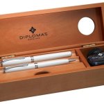 Velice precizní stolní set Diplomat z třešňového dřeva. Odnímatelná vrchní část na 2 pera, pod kterým je úložný prostor na příslušenství. Dodáváno s modrým inkoustem a konvertorem pro Vaše pera Diplomat. Dodáváno bez per!