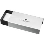 Kvalitní celokovové kuličkové pero Diplomat s chromovaným tělem zdobeným giloš vzorem. Zajímavě tvarovaný klip i doplňky jsou pochromované. Otočný mechanismus pro vysunutí černé velkokapacitní náplně. Dodáváno v elegantní dárkové krabičce.