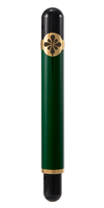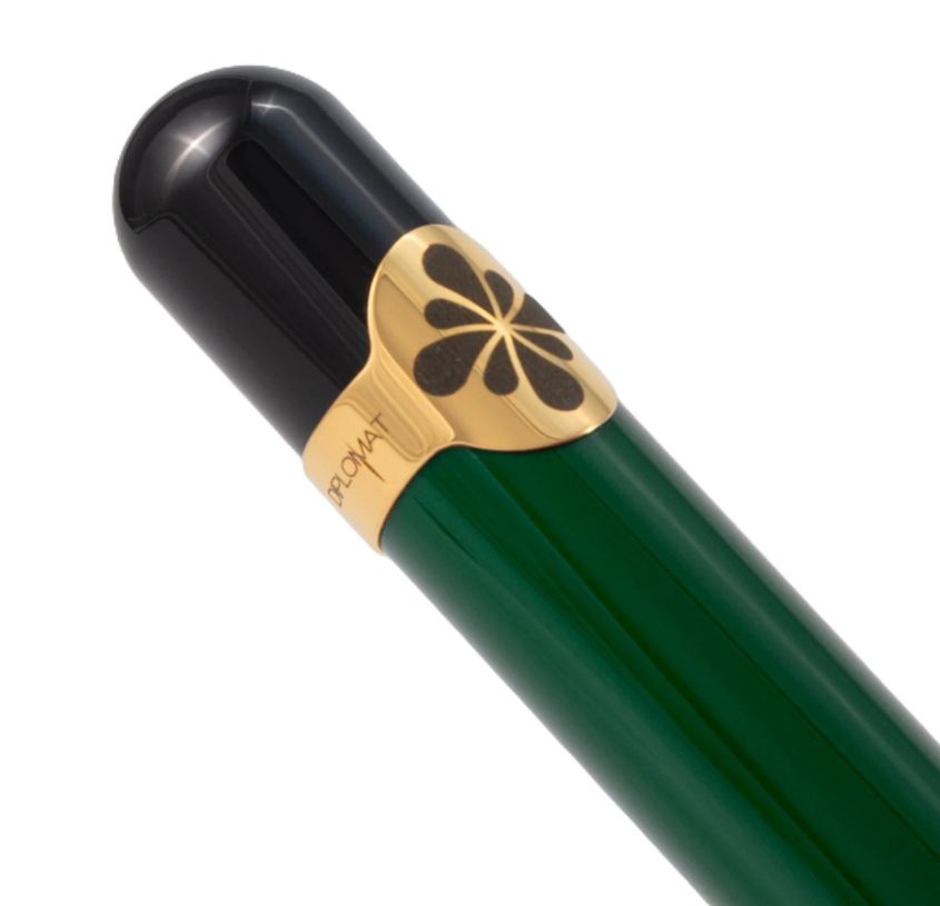 Diplomat X.O Triple 5 Racing Green je plnicí pero pro ty, kteří si potrpí na detaily. Plynule zaoblené tělo v typickém tvaru doutníku přirozeně padne do ruky a jeho hluboký zelený lak připomíná legendární odstín britských sportovních vozů. Zlacený prstenec na víčku vizuálně odkazuje na pásky jemných doutníků a dodává peru osobitý charakter. Tělo z kovu s kvalitním lakem působí robustně, ale svou hmotností zůstává příjemné i při delším psaní.