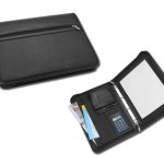 Mapa na dokumenty na zip z imitace kůže s kroužkovou vazbou, blokem A4 a kalkulačkou. celý popis