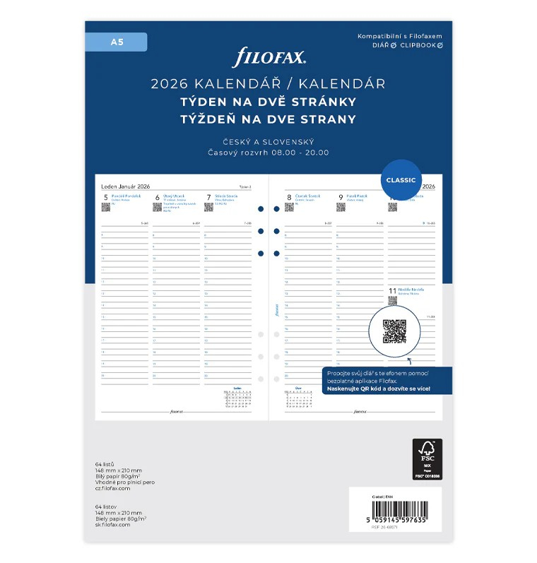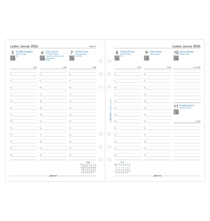 Český a slovenský kalendář 2026 týden na 2 stránky pro diáře Filofax o velikosti A5. Formát papíru 148 x 210 mm. QR kódy pro propojení diáře s telefonem pomocí bezplatné aplikace Filofax.