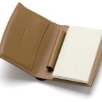Elegantní poznámkový bloček v kožených, ručně vyráběných, deskách, které se otevírají na šířku. Vyrobeno z kůže vylisovanou zrnitou strukturou. Uvnitř je poutko na pero. Vyrobeno v Německu z nejlepších materiálů s maximálním důrazem na kvalitu zpracování. Rozměry 110 x 76 mm.