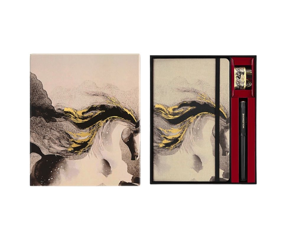Součástí sady je také kuličkové pero Kaweco a dvě dekorativní washi pásky z kolekce Year of the Horse. Kuličkové pero Kaweco s tělem a víčkem z ABS plastu v černé barvě má ergonomický trojhranný úchop pro pohodlné psaní. Celý set vychází z inspirace čínského roku koně a živlu ohně, který symbolizuje energii, odvahu a svobodu myšlení. Dodáván je v elegantním dárkovém boxu, který podtrhuje sběratelský charakter celé kolekce.