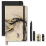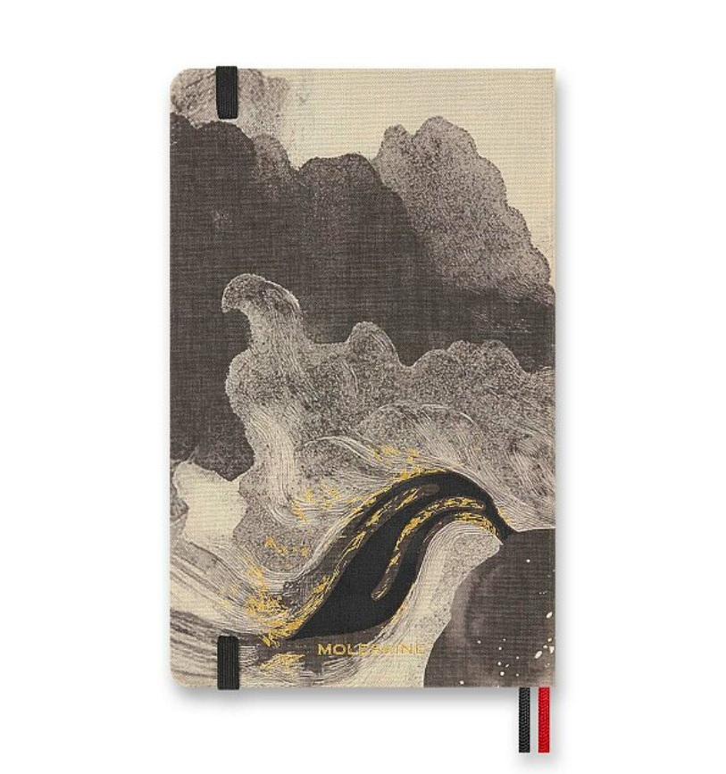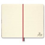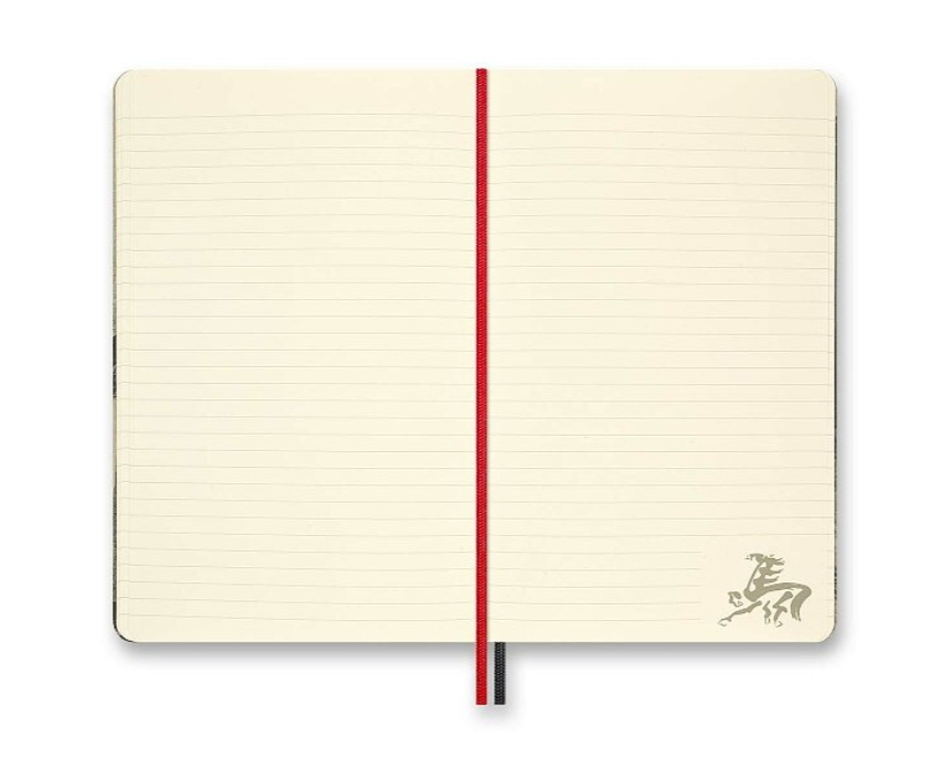 Srdcem sady je klasický linkovaný zápisník Moleskine s pevnou šitou vazbou v deskách z materiálu Assuan – italského knihařského plátna s výraznou strukturou, které působí elegantně a zároveň odolně. Vybrané části desek využívají inkoust reagující na teplo, který při dotyku krátce mění barvu a vytváří dynamický efekt inspirovaný živlem ohně. Papír o gramáži 100 g/m² má příjemný slonovinový odstín, je vyroben z FSC certifikovaného dřeva a je vhodný pro každodenní psaní poznámek i delších textů. Rozměry L - A5 (13 x 21 cm), obsahuje 88 linkovaných listů. Zápisník je v anglickém jazyce.