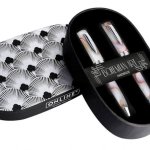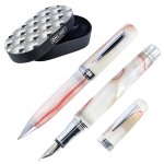 Krásná sada plnicího a kuličkového pera ručně vyrobená ze syntetické pryskyřice. Každý kus je originál a vzor se může mírně lišit. Plnicí pero má ocelový hrot v šířce M - střední, šroubovací víčko a součástí balení je modrá bombička. Kuličkové pero má otočný mechanismus pro vysunutí náplně, součástí balení černá náplň. Dodáváno v dárkové krabičce.