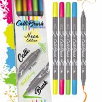 Sada 5 kaligrafických fixů v neonových barvách s kaligrafickým 2 mm hrotem na jedné straně a flexibilním štětcem na druhé. celý popis