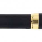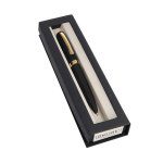 Elegantní kovové kuličkové pero Online Eleganza s matně černou lakovanou povrchovou úpravou v kombinaci s doplňky ve zlaté barvě. Otočný mechanismus pro vysunutí velkokapacitní náplně. Dodáváno v papírové krabičce.