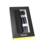 Sada elegantního kovového plnicího a kuličkového pera Online Eleganza s lakovanou povrchovou úpravou v barvě modré noční oblohy, v kombinaci s leskle lakovanými doplňky a zdobené liniemi. Plnicí pero Online Eleganza má hrot z nerezové oceli s iridiovou špičkou. Šířka hrotu M - střední. Víčko je nasazovací. Pero je vybavené systémem na bombičky i na plnění konvertorem, který není součástí balení. Kuličkové pero je vybaveno otočným mechanismem pro vysunutí velkokapacitní náplně. Součástí balení jedna bombička a jedna náplň do kuličkového pera. Dodáváno v papírové krabičce s pouzdrem.