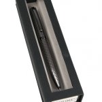 Elegantní kovové kuličkové pero Online Eleganza s lakovanou povrchovou úpravou v šedé titanové barvě v kombinaci s leštěnými doplňky, zdobené liniemi. Otočný mechanismus pro vysunutí velkokapacitní náplně. Dodáváno v papírové krabičce.