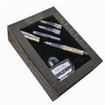 Dárková sada obsahuje plnicí pero Online Campus Marble Braze s hrotem M - střední, konvertor pro plnění pera inkoustem, 2 úchopové části - hrot EF a kaligrafický hrot šířky 1,4 mm a lahvičku s černým inkoustem (50 ml).