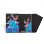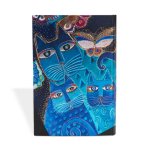Luxusní linkovaný zápisník s magnetickým zavíráním Paperblanks Midi s motivem koček a motýlů od Laurel Burch. Rozměry zápisníku jsou 130 x 180 mm (něco mezi A5 a A6), vazba je sešívaná. 160 linkovaných stran, na zadních deskách je kapsa pro poznámky nebo vizitky. Zápisník má také textilní záložku.