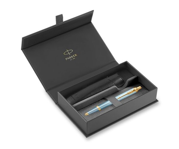 Kuličkové pero Parker I.M. Writing Rituals GT má mosazné tělo pokryté saténově metalickým tyrkysovým lakem s pozvolným přechodem odstínu barvy. Doplňky jsou pozlacené pomocí techniky PVD. Stiskací mechanismus pro vysunutí velkokapacitní náplně. Součástí balení jedna náplň. Dodáváno s pouzdrem a voucherem na kurz Akademie psaní v elegantní dárkové krabičce.
