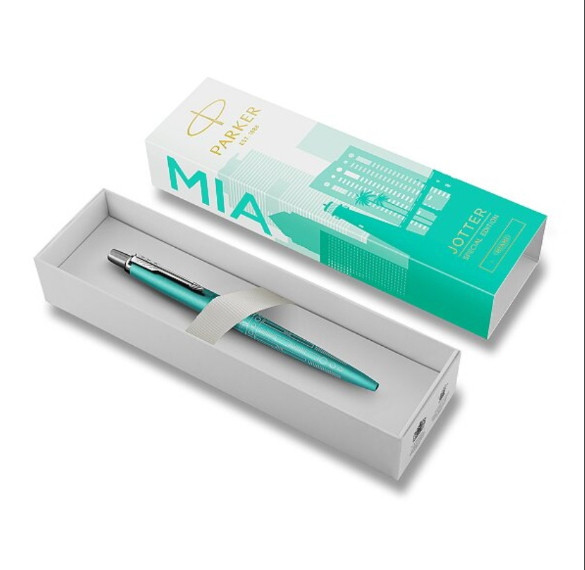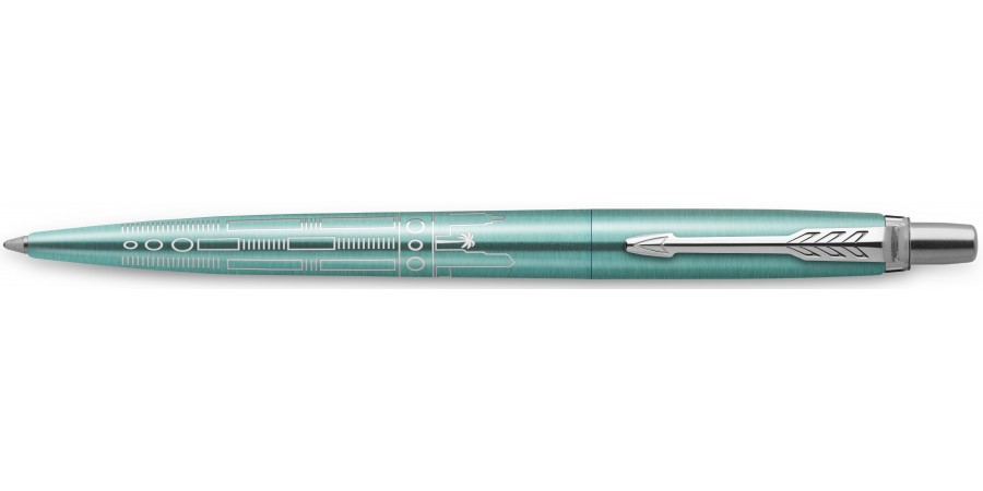 Parker Jotter Miami ze speciální edice má tyrkysové lakované tělo zdobené vzorem panoramatu města Miami. celý popis