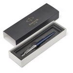 Parker Jotter Royal Blue má tělo z modře lakované broušené nerezové ocele, které vytváří vkusný kontrast s nerezovou vrchní částí pera. Klip a zdobení je pokovené chromem a leštěné. Kuličková tužka je opatřena stiskacím mechanismem pro vysunutí velkokapacitní náplně. Dodáváno v elegantní dárkové krabičce.