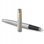 Pero Jotter Stainless Steel GT má tělo z broušené nerezové ocele, které vytváří vkusný kontrast s klipem pokoveným zlatem. Hrot je vyroben z nerezové oceli. V nabídce pouze hrot M (střední). Víčko je nasazovací. Pero je vybavené systémem na bombičky i na plnění konvertorem. Dvoukanálový systém zásobování hrotu inkoustem, konvertor není součástí balení. Součástí balení modrá bombička. Dodáváno v elegantní dárkové krabičce.