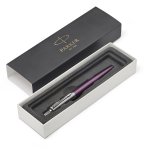 Model Jotter Victoria Violet má tělo z fialově lakované broušené nerezové ocele, které vytváří vkusný kontrast s nerezovou vrchní částí pera. Klip a zdobení je pokovené chromem a leštěné. Kuličková tužka je opatřena stiskacím mechanismem pro vysunutí velkokapacitní náplně. Dodáváno v elegantní dárkové krabičce.