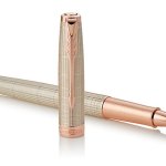 Keramické pero Parker Royal Sonnet Silver PGT má tělo a víčko z mincovního stříbra pokryté ochranným lakem, zdobené povrchovou strukturou. Doplňky jsou pokovené růžovým zlatem. Víčko zabraňující vysychání náplně je nasazovací. Dodáváno v elegantní dárkové krabičce s 1 černou náplní vloženou mimo pero.