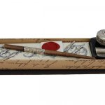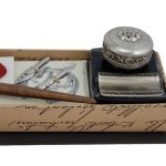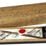 Značková kaligrafická sada obsahuje pero se čtyřmi hroty a kalamář s černým inkoustem. celý popis