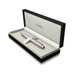 Kuličkové pero Scrikss Chic s mosazným tělem v růžové lakové úpravě a s pochromovanými doplňky. Neobvykle vysoká vrchní část pera nad klipem. Otočný mechanismus pro vysunutí modré náplně. Dodáváno v dárkové krabičce.