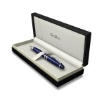 Masivní kuličkové pero Scrikss Havana v modré lakové úpravě s černým kroužkem na vrchní části. Netradičně zalomený klip a doplňky jsou pochromované. Otočný mechanismus pro vysunutí náplně. Dodáváno v dárkové krabičce.