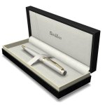 Kuličkové pero Scrikss s mosazným tělem lakovaným několika vrstvami saténově stříbrného laku. Doplňky jsou pozlacené 23 karátovým zlatem. Klip je také pozlacený. Otočný mechanismus pro vysunutí velkokapacitní náplně. Dodáváno v dárkové krabičce.