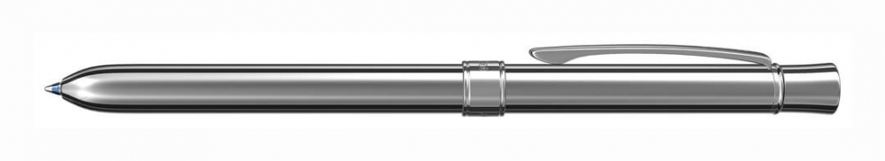 Značkové multifunkční pero 3v1 - modrá a červená kuličková tužka a mikrotužka 0,5 mm - výběr se provádí otáčením těla. Pryž je schovaná ve vrchním víčku. Tělo pera je pochromované. Dodáváné v dárkové krabičce s logem výrobce.