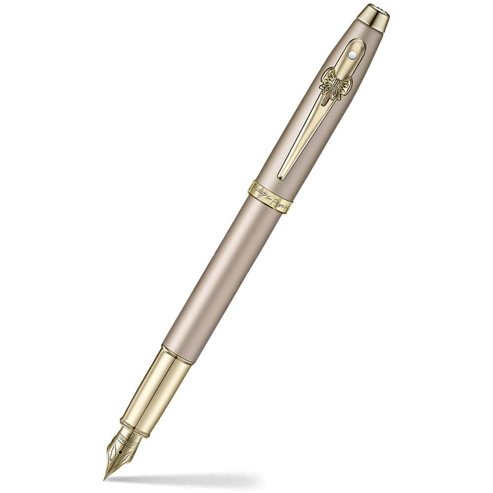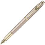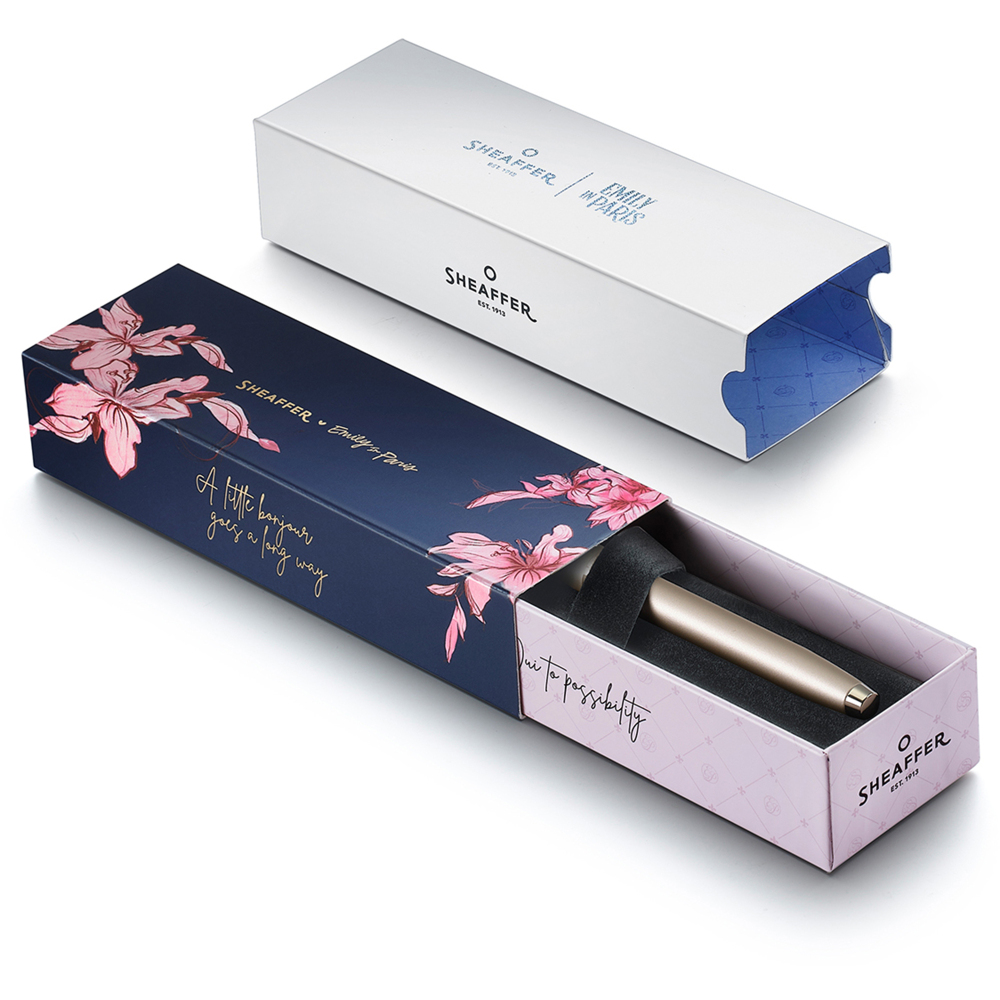 Sheaffer 100 Champagne Emily in Paris GT je jako malý šperk. Stylové plnicí pero v barvě šampaňského se zlatými detaily je ódou na nenucenou pařížskou eleganci – bez zbytečné námahy, zato s plnou pozorností okolí. Hrot je vyrobený z nerezové ocele a je pokovený technikou PVD zlatou barvou. Víčko je nasazovací. Součástí balení je bombička a konvertor. Na klipu se blyští kovová mašle, nechybí Eiffelovka a decentní logo Emily in Paris. Klasická silueta pera se změnila v designový kousek, co má sběratelskou hodnotu, ale také se s ním dobře píše. Hladce, spolehlivě, s tím správným „flow“ pro podpisy, zápisky i vzkazy, které nezapadnou. Díky celokovovému mosaznému tělu vydrží i náročnější pracovní tempo. Bonus? Pěkná dárková krabička s květinovým vzorem.