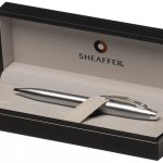 Klasické kovové kuličkové pero s broušenou chromovou povrchovou úpravou. Moderní pružný klip s Sheaffer bílou tečkou, úzký kroužek s logem značky. Otočný mechanismus pro vysunutí náplně. Pero je dodáváno v dárkové krabičce.