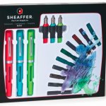 Kaligrafická sada Sheaffer je vhodná pro začátečníky kaligrafisty. Obsahuje tři plastová pera v moderních zářivých barvách. Tři různé hroty - F (1.0 mm), M (1.5 mm) a B (2.0 mm), 15 zkušebních papírů a 20 inkoustových bombiček různých barev (3x černá, 3x modrá, 3x modročerná, 3x hnědá, 2x červená, 2x zelená, 2x fialová, 2x tyrkysová). Vše je uloženo v dárkové krabičce.