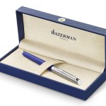 Keramické pero Waterman Hémisphere DeLuxe Blue Wave má modře lakované mosazné tělo. Víčko je vyrobené z broušené nerezové oceli a zdobené jemnými a precizně vyvedenými rytinami (pomocí laseru). V kombinaci s doplňky pokovenými palladiem. Víčko je nasazovací. Dodáváno s černou náplní pro rollery. Do pera je možné používat i standardní náplň pro kuličkové tužky. Dodáváno v dárkové krabičce.